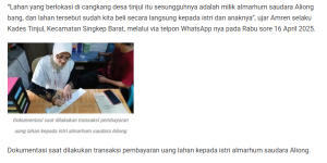 Sayangnya SHP tersebut kini diduga kuat telah diperjualbelikan, salah satunya dugaan praktek jual beli yang dilakukan oleh Kades Tinjul, Amren yang sempat diakuinya dalam salah satu media mengatakan, “Persoalan lahan ini menurut kami sudah jelas hak atas kepemilikannya bang, dan kami juga melakukan transaksi pembayaran jual beli disertakan dokumen berupa surat ‘DJAWATAN AGRARIA’ Kutipan dari Surat Keputusan Kepala Agraria Daerah Kepulauan Riau tentang Pemberian Hak Pakai yang diterbitkan oleh Kepala Agraria Kepulauan Riau Tahun 1962″, ungkapnya dikutip dari media cahayanewskepri.com, Minggu 20 April 2025.
